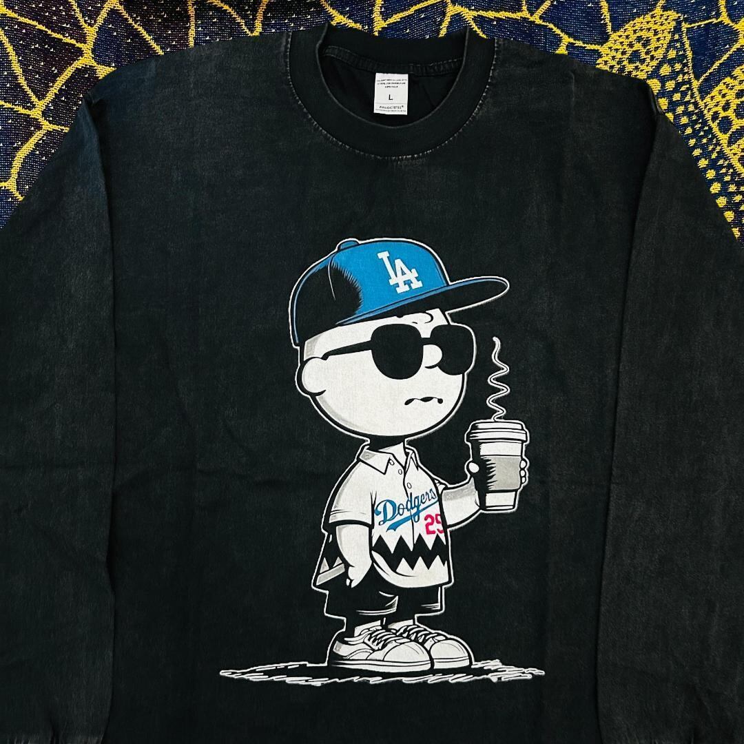 ドジャース チャーリーブラウン リプリント ロンT 長袖 黒 R104 fubby Gremlins クリスマス SFブラック ウォッシュ加工
