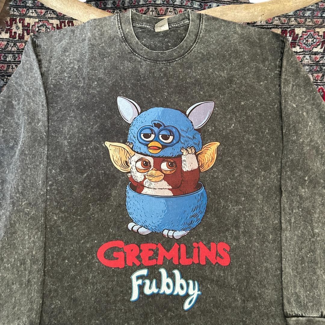 ファービー feat グレムリン グレー ロンT 長袖 メンズ R102 fubby Gremlins クリスマス SFブラック ウォッシュ加工