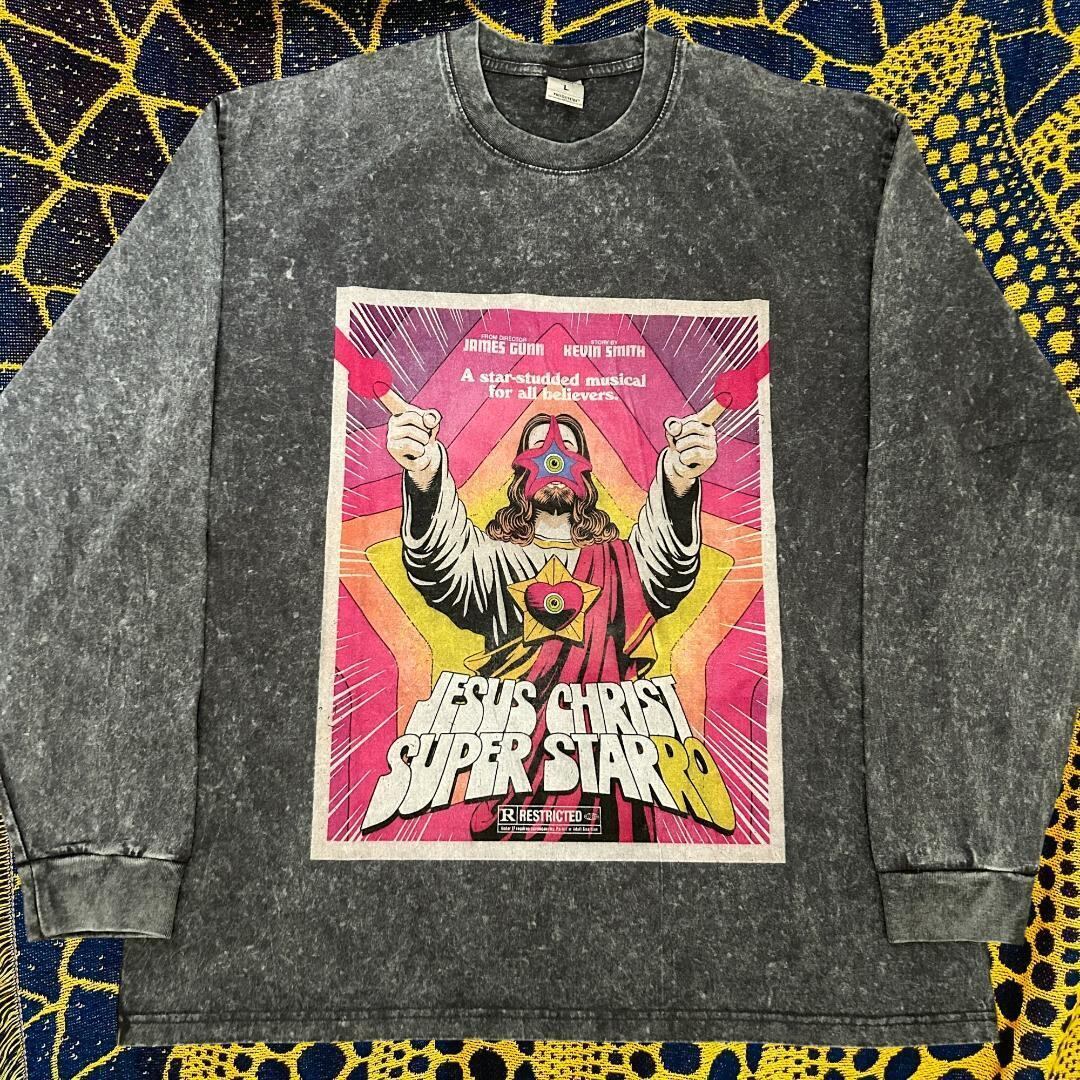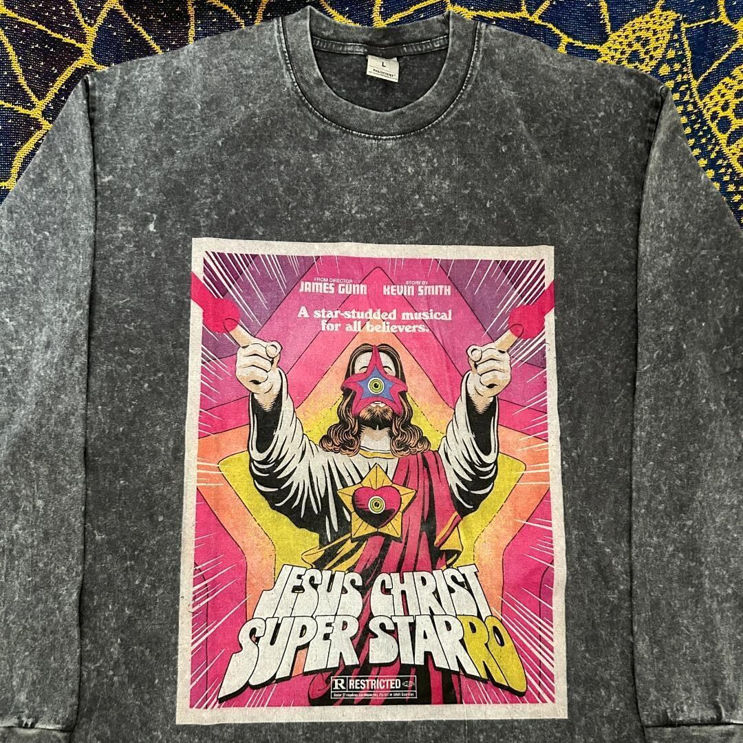 Jesus 覚醒 リプリント ウォッシュ加工 ロンT 長袖 黒 N57 新品 レトロ 個性的 奇抜 エモい カットソー 攻め 前衛的 ヴィンテージプリント 秋冬 トップス お洒落 ハイデザイン 男性
