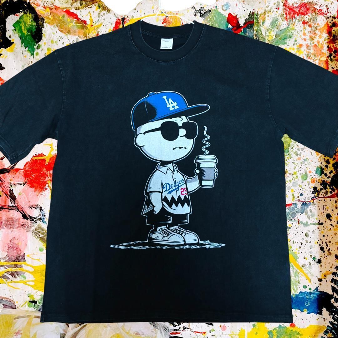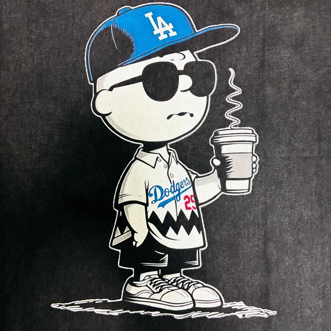 ドジャース チャーリーブラウン リプリント ウォッシュ Tシャツ 半袖 黒 Dodgers スヌーピー ウォッシュ加工 半袖 Tシャツ XL 2XL 黒 Dodgers Tシャツ ティーシャツ ダメージ加工 攻め 前衛的 男性